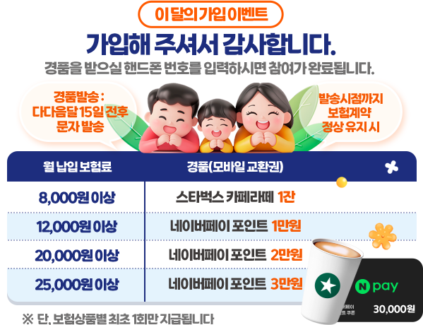 이번 달 가입하면 다다음 달 15일 전후 경품 지급 (상품당 1회)(보험가입 후 2개월 정상유지 시)